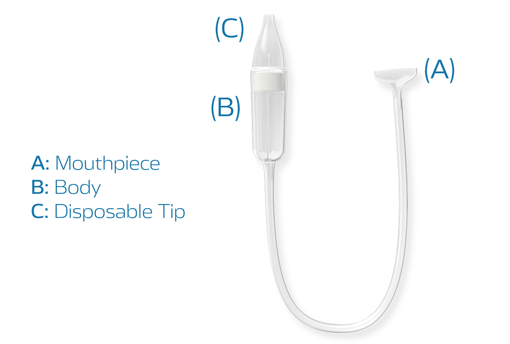 - Place the mouthpiece (A) between your lips and the tip of the aspirator (C) in your baby's nostril. The mouthpiece should be held firmly between the lips.